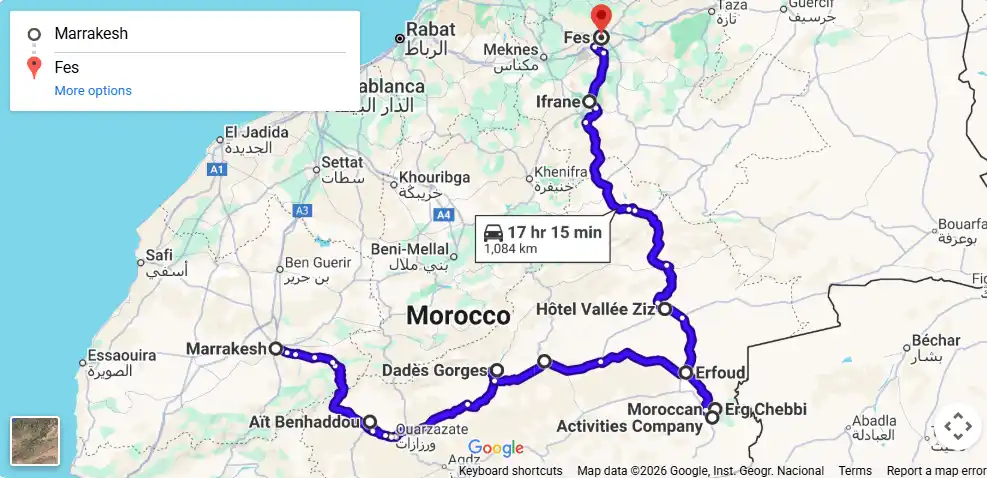 Your journey ends in Fes, after crossing the Middle Atlas Mountains, cedar forests, and Berber towns — offering a complete Morocco desert experience.